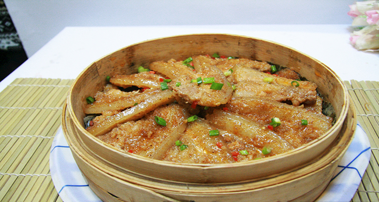 制作方法與我們平時(shí)家常菜粉蒸肉有些不同,更為復(fù)雜講究。采用合適比例的粳米和糯米,將辣椒、桂皮、八角、香葉等多種香料炒出濃郁的香氣,然后再磨成細(xì)粉,包裹在提前腌制好的肉片上,最后放入竹籠蒸制一小時(shí)。由于蒸制時(shí)間長,一部分油脂被釋放,成品軟糯潤滑油入口即化,醇香繞舌,完全沒有油膩的感覺。